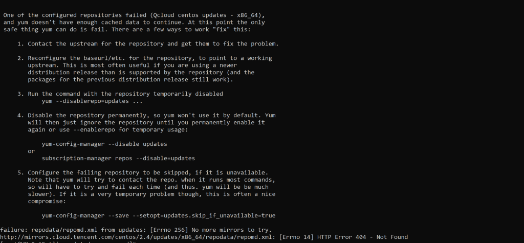 2022-11-12 云服务器与建站►运维与环境 TencentOS Server 2.4 出现软件源的问题 不知道是不是 CentOS7 停服的问题,兼容于 CentOS7 的 TencentOS Server 2.4 使用 yum 出现源错误的提示。 /yum mackcache 会返回如下错误 还在找腾讯云客户,等答案中。 ———-分界线 最终,腾讯云工程师处理如下: 您好,抱歉让您久等了,这里使用yum-config-manager命令配置跳过异常的存储源之后,可以正常使用yum命令,您稍后测试。感谢您的支持。 他们处理后,确实可以用了,但仍然会提示有源异常,只能忽略了。勉强凑合用着。 本文发表日期: 2022-11-12 前一篇 Citizens Band Radio Service (CBRS) 后一篇 win10、win11便笺 显示无法验证登录信息 无法连接到服务器。错误代码0x80072EFD