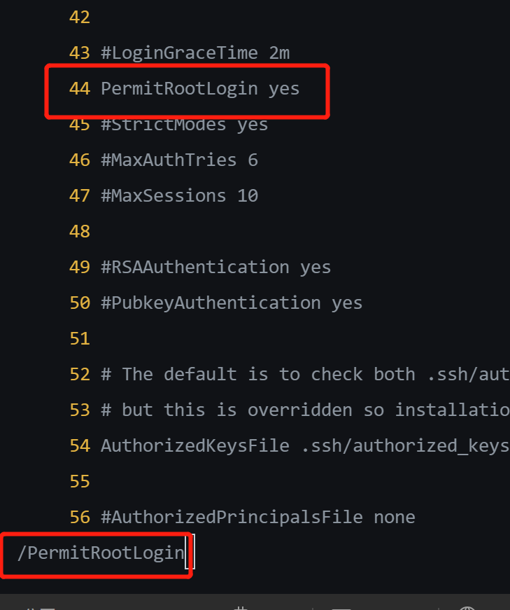 输入”/“命令进行查找“PermitRootLogin”:
