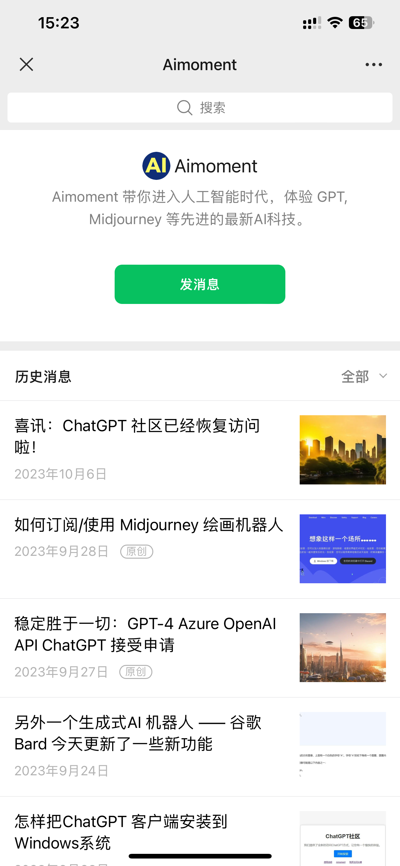 当用户点击了菜单,就会出现如下图一样的历史发表记录,让用户,特别是新用户第一时间浏览历史文章,加深用户对公众号的认识。
